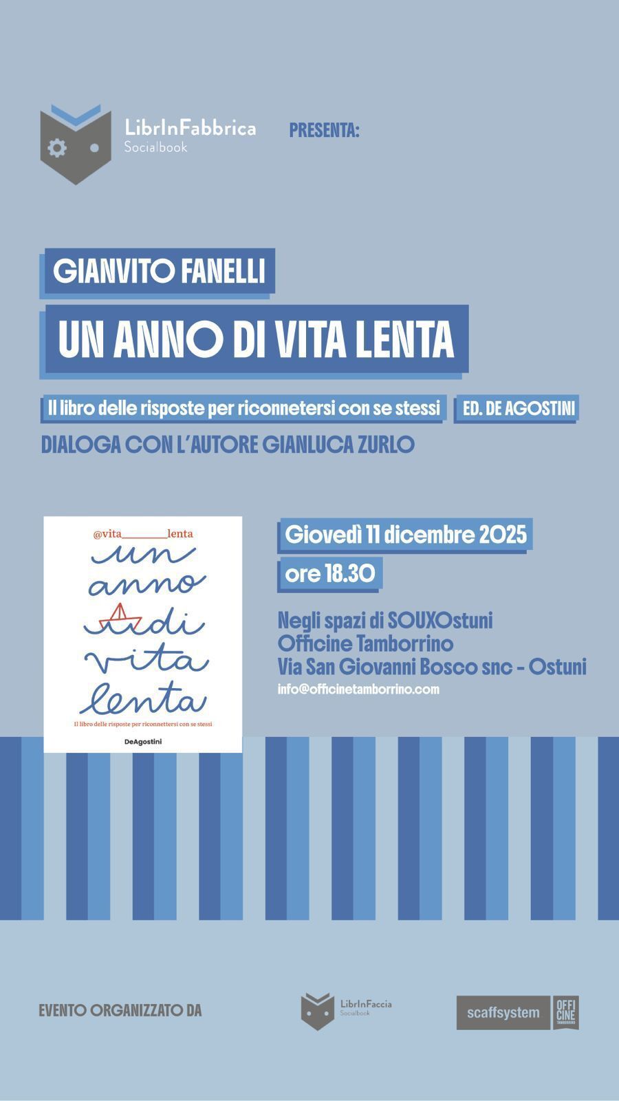 -Giovedì 11 dicembre, alle 18.30, la Scuola SouxOstuni – Officine Tamborrino ospiterà un nuovo appuntamento di Librinfabbrica, la rassegna dedicata ai libri, alle idee e agli incontri che mettono in movimento la comunità.