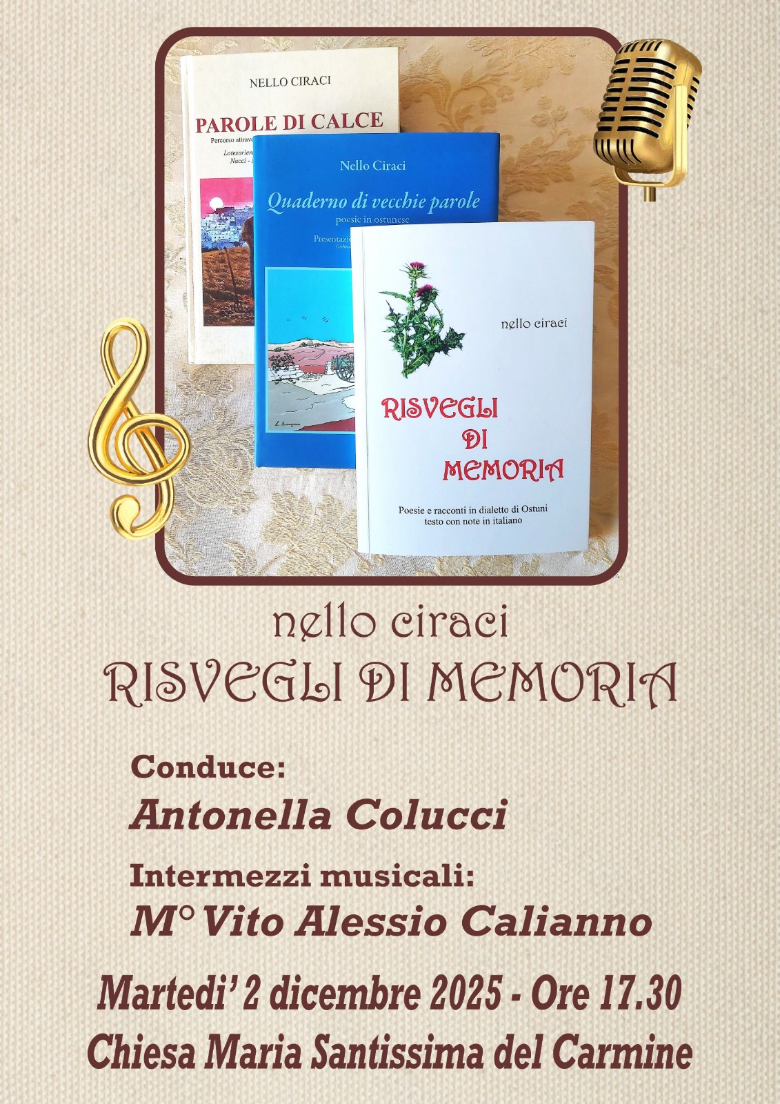 Un nuovo libro del professor Nello Ciraci, grande uomo di cultura, con un’ampia visione della storia universale e locale, appassionato cultore della tradizione dialettale ostunese, è stato presentato il 2 dicembre nella Chiesa del Carmine con la conduzione dell’attrice professoressa Antonella Colucci e gli intermezzi musicali del Maestro Vito Alessio Calianno.